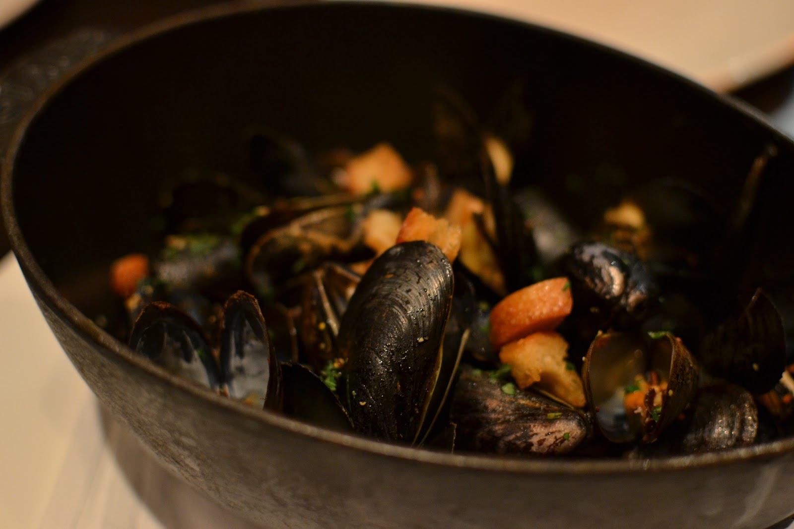 cast iron mussels . white wine . shallots crème fraîche . dill . croutons 15